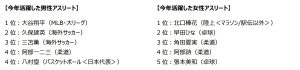「来年活躍が期待できる」アスリートは、男性で1位:大谷翔平(MLB・大リーグ)、2位:久保建英(海外サッカー)、3位:佐々木朗希(プロ野球<国内>)、4位:山本由伸(MLB・大リーグ)、5位:三笘薫(海外サッカー)/河村勇輝(バスケットボール<日本代表>)となりました。女性は1位:早田ひな(卓球)、2位:張本美和(卓球)、3位:池江璃花子(水泳<競泳>)/阿部詩(柔道)/北口榛花(陸上<マラソン/駅伝以外>)となりました。