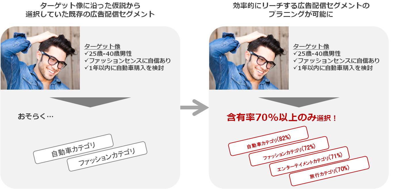 パネル属性項目・アンケート回答項目から設定したターゲット像の含有率を、Web動画広告、バナー広告の広告配信セグメントで事前に把握することが可能になります。マーケティング戦略に基づいて設定されたターゲット像へ的確にリーチできる広告配信セグメントを、含有率の高低をもとに判断することができます。また、決定した広告配信セグメントに対しては、動画広告/バナー広告等の様々なWeb広告で直接リーチすることも可能になります。