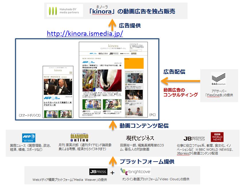 株式会社博報堂DYメディアパートナーズ、デジタル・アドバタイジング・コンソーシアム株式会社(以下DAC)、株式会社日本ビジネスプレス、ブライトコーブ株式会社の4社は、2015年2月27日より運営を開始したエグゼクティブ&マネジメント層(年収1,000万円以上、経営層等)をコア・ターゲットとした動画ポータルサイト「kinora(キノーラ) ※1 」(PC・スマートデバイス対応、事務局:日本ビジネスプレス社)への、動画広告配信サービス「kinora 動画アドネットワーク」の開発・運営を開始いたします。「kinora」は、「AFPBB-News」「ダイヤモンド・オンライン」「現代ビジネス」「JBpress(BBC WORLD NEWSを含む)」が提供する著名ジャーナリストによるコラムや国際ニュース、企業イノベーション、あるいは働く女性向けの料理レシピ等、ビジネスパーソン向けの幅広い動画コンテンツ※2を、PCからもスマートデバイスからも最適な環境で視聴できるポータルサイトです。本サービスは、主にエグゼクティブ&マネジメント層に対するコミュニケーションにおいて、企業や商品・サービスの認知や関心、ブランドイメージを高めたいと考えている広告主の課題解決を目指します。