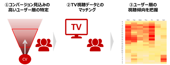 「Handy TV Insight」は、「Yahoo!メディアオーディエンスパネル」から取得するTV視聴ログ、Yahoo! JAPANサイトの行動データや、広告主サイトのコンバージョンデータなど、目的に応じたさまざまなデータを活用し、オンライン上でのアクションを最大化する効果的なTVCMプラニングを提示します。たとえば、Yahoo! JAPANが提供する広告経由で蓄積したコンバージョンデータをもとに、今後コンバージョンする可能性が高いユーザー層を抽出、それらユーザー層の番組視聴傾向を明らかにします。これにより、広告主のKGI(Key Goal Indicator / 重要目標達成指標)に直接的に貢献する、より高度なTVCMプラニングが可能となります。