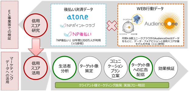 今回の共同研究では、このような課題を解決するために、デジタル・アドバタイジング・コンソーシアム株式会社(以下DAC)とデータ・フォアビジョンが共同開発した金融機関向けの信用スコア計量モデル(※2)と、DACが提供するデータ・マネジメント・プラットフォーム(DMP)「AudienceOne」(※3)のオーディエンスデータ、博報堂DYメディアパートナーズが推進する生活者データ(※4)、ネットプロテクションズが保有する決済データを活用し、「Credit Tech」サービスにおける共同研究を行います。それにより、既存の金融機関向けの信用スコア計量モデルに加えて、生活者の決済データを活用した研究を行うことで、後払い決済向けの信用スコア計量モデルの開発が期待できます。