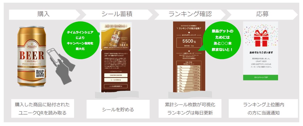 「ランキングマイレージ™」は、店頭で購入した対象商品からQRコードを読み取り、LINE上でキャンペーンに応募できるプラットフォームです。商品購入によるシールをLINEアプリ内で蓄積することができ、自分の獲得シールが応募者の中でランキング化され、毎日更新されます。応募者は自分のランキングがタイムリーに把握できるため、ランキング上位圏内(欲しいプレゼントの獲得圏内)を目指し、購買を継続していくことが予想されます。また、キャンペーン期間中に応募者にLINE上でメッセージを配信する等、購買行動を更に促進することも可能となります。