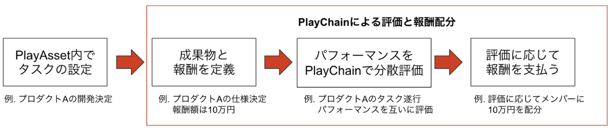 DAOは会社組織の中にある様々な仕事一つ一つを契約化し、スマートコントラクトで自動化していくことで経営者が存在しなくとも自律分散的に運営される組織のことを指します。「PlayChain」はこのDAOの考え方に基づいて運用することを想定しており、タスクをスマートコントラクト化し、トークンを送り合うことでお互いを分散評価し、その評価によって報酬を支払うためのツールとして開発しました。「PlayAsset」内で運用を始め、「PlayAsset」が掲げる「ゲームを遊ぶことが価値になる世界、Play to Asset」を実現するためにチームが自律分散的に機能されることを目指します。