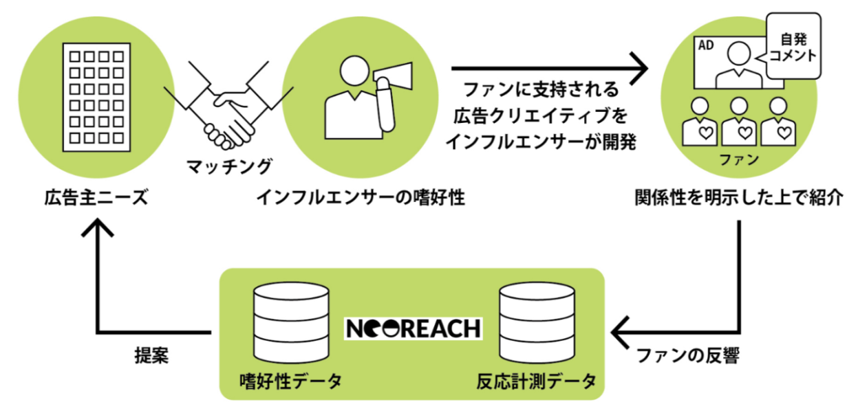 そのための仕組みとして、米国NeoReach社(※2)の日本進出の戦略パートナー権をDACが取得し、国内外のインフルエンサーによるこれまでの投稿からインフルエンサーおよびそのフォロワーの属性・嗜好性などを広く把握できるプラットフォーム「NeoReach」を活用することにより実現します。