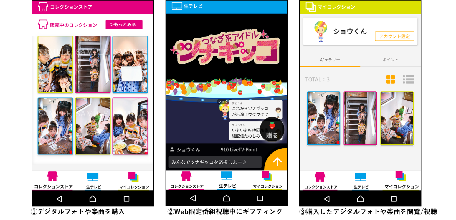 12月末からNST新潟総合テレビの情報番組「八千代ライブ」に提供する専用プラットフォームでは、視聴者は、同番組の企画で結成されたアイドルユニット「ツナギッコ」の限定オリジナルフォトや楽曲を購入したり、Web限定配信番組を視聴しながらサイトのギフティング(贈る)ボタンを押下することで、直接ツナギッコを応援、その活動を支援することできます。番組は、ファンからの支援をツナギッコの具体的な活動に活かすことで、ファンとのつながりを構築しながら、双方向の番組作りを実現します。