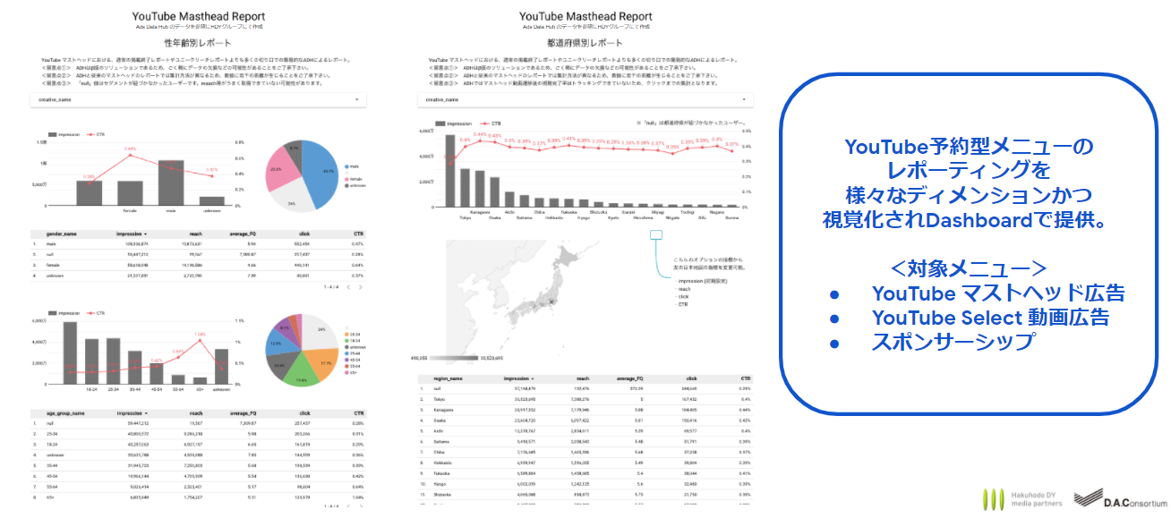 YouTube 広告予約型メニューにおいて、今までの掲載終了レポートでは見られない性別年齢別や都道府県別での配信結果を確認することができ、予約型のPDCAの精度を高めるために、活用できます。