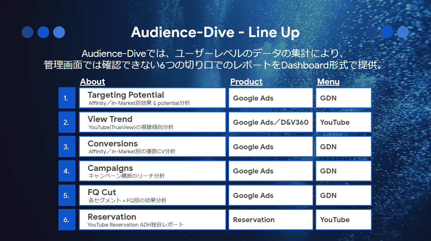 「Audience Dive」には広告オーディエンスを深堀するための多面的な6つの分析の切り口(図2)である 「Targeting Potential」「View Trend」「Conversions」「Campaigns」「FQ Cut」「Reservation」があり、それぞれ視覚化されたUI(ユーザーインターフェース)で確認することができます。