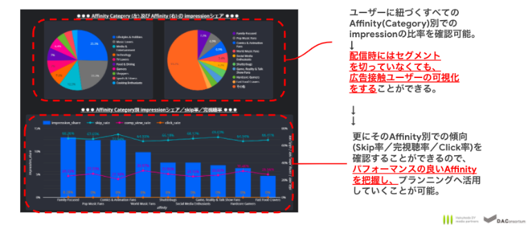 アフィニティやIn-Marketに基づいて、どのターゲティングセグメントにポテンシャルがあるかを確認することができます。配信時に設定していないセグメントでも、配信後に各セグメントの結果を確認できるため、少ない配信回数で今後のプランニングに活用できるヒントを得ることができます。