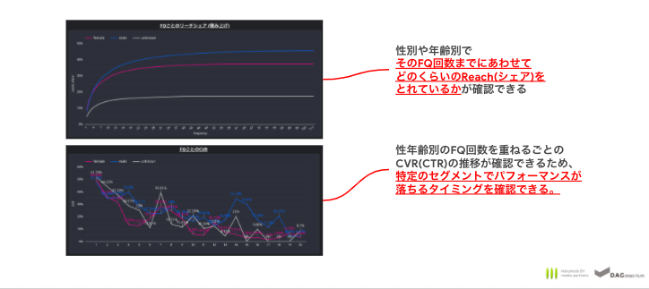 ユーザーレベルのデータの集計による接触回数(FQ)毎のパフォーマンス結果を、性別/年齢別で確認することができます。各セグメント最適な接触回数の策定や、接触回数と広告効果の関係を確認することができます。