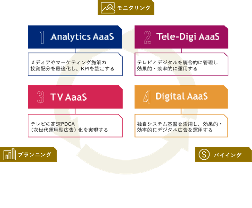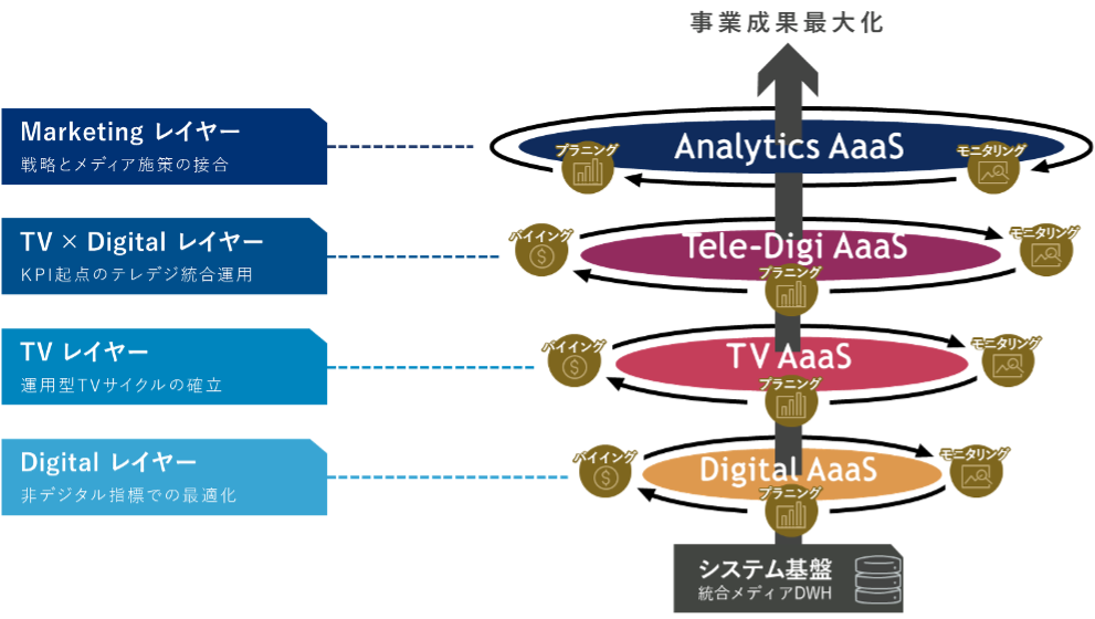 Marketingレイヤーに対応するサービスとして、数理モデリングにより広告主のメディアやマーケティングの投資配分を最適化し、KPI設定を行う「Analytics AaaS」、TV×Digitalレイヤーに対応するサービスとして、テレビとデジタルを同じ指標で統合的に管理し最適なテレデジ運用に繋げていく「Tele-Digi AaaS」、TVレイヤーに対応するサービスとして、常時接続型時代のテレビの高速PDCA(次世代運用型)を実現する「TV AaaS」、そしてDigitalレイヤーに対応するサービスとして、データ基盤を軸により効果・効率的なデジタル広告運用を実現する「Digital AaaS」として今後推進して参ります。