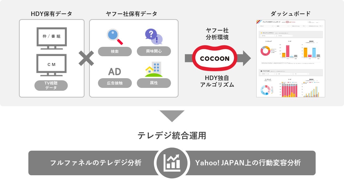 株式会社博報堂DYメディアパートナーズ(本社:東京都港区、代表取締役社長:矢嶋弘毅、以下 博報堂DYメディアパートナーズ)は、テレビとデジタルの共通指標での統合運用、分析を支援するソリューション”Tele-Digi AaaS” であらたに「Yahoo! JAPAN」のデータを活用し、テレビCMや「Yahoo! JAPAN」上のユーザー行動の効果を可視化するサービスの提供を開始します。