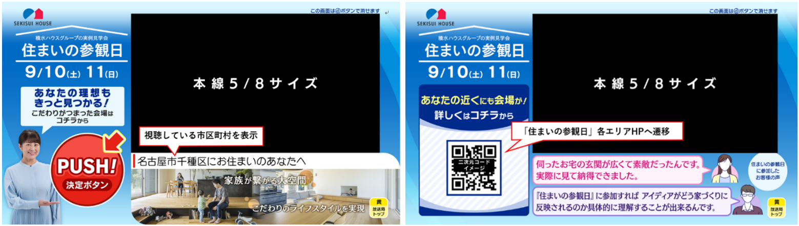 ・CM中に自動表示されるデータ放送にて、テレビに登録された郵便番号を基にエリアターゲティングを行い、視聴エリアによって異なる情報を表示。
