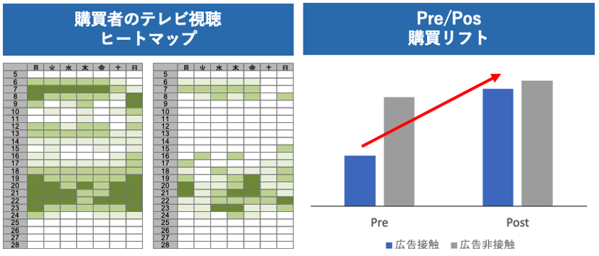 オフライン購買データとテレビ視聴データを組み合わせることで、購買者のテレビ視聴タイミングを可視化したヒートマップや視聴番組ランキングなどを出力、より購買につながるプラニングが可能となります。
