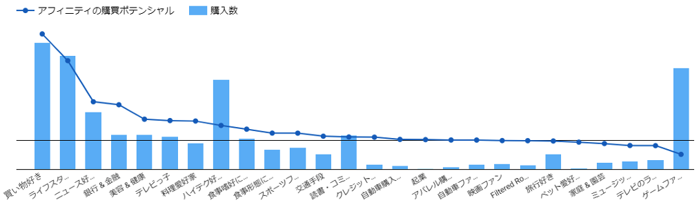 オフライン購買データとオンラインデータを組み合わせることで、購買者の含有率の高いアフィニティを特定し、ターゲティング配信への活用が可能です。これにより、購買をもとにしたオンライン上の生活者の興味/関心を可視化するとともに、購買に寄与可能性の高いセグメントへの配信を行うことができるようになり、購買データを起点にしたデジタルプラニングを実現します。