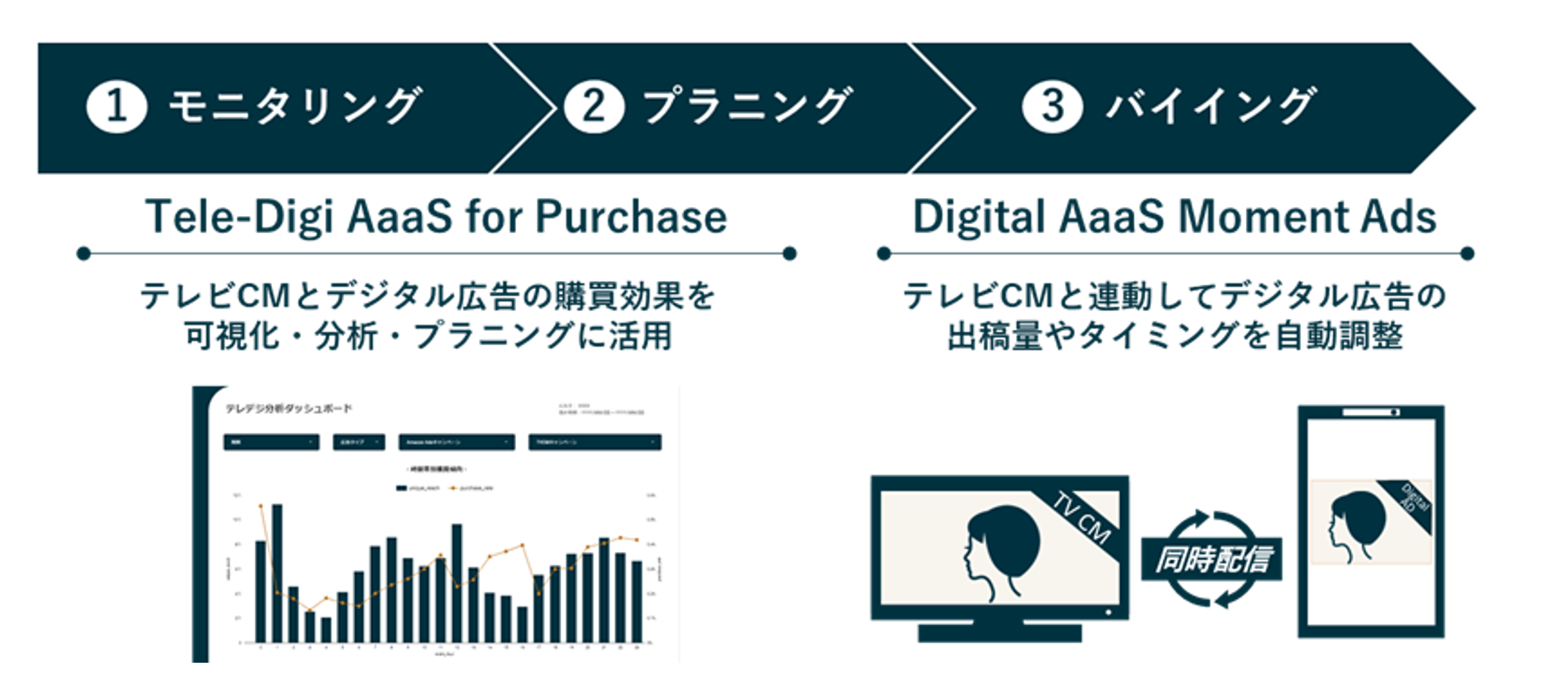 本ソリューションにより、購買起点でのモニタリングからプラニング、バイイングの一気通貫した最適化を行うことができますが、更にDigital AaaS Moment Ads(※3)を組み合わせることでテレビCMと連動したデジタル広告の配信も可能となり、運用の更なる高度化を実現できます。