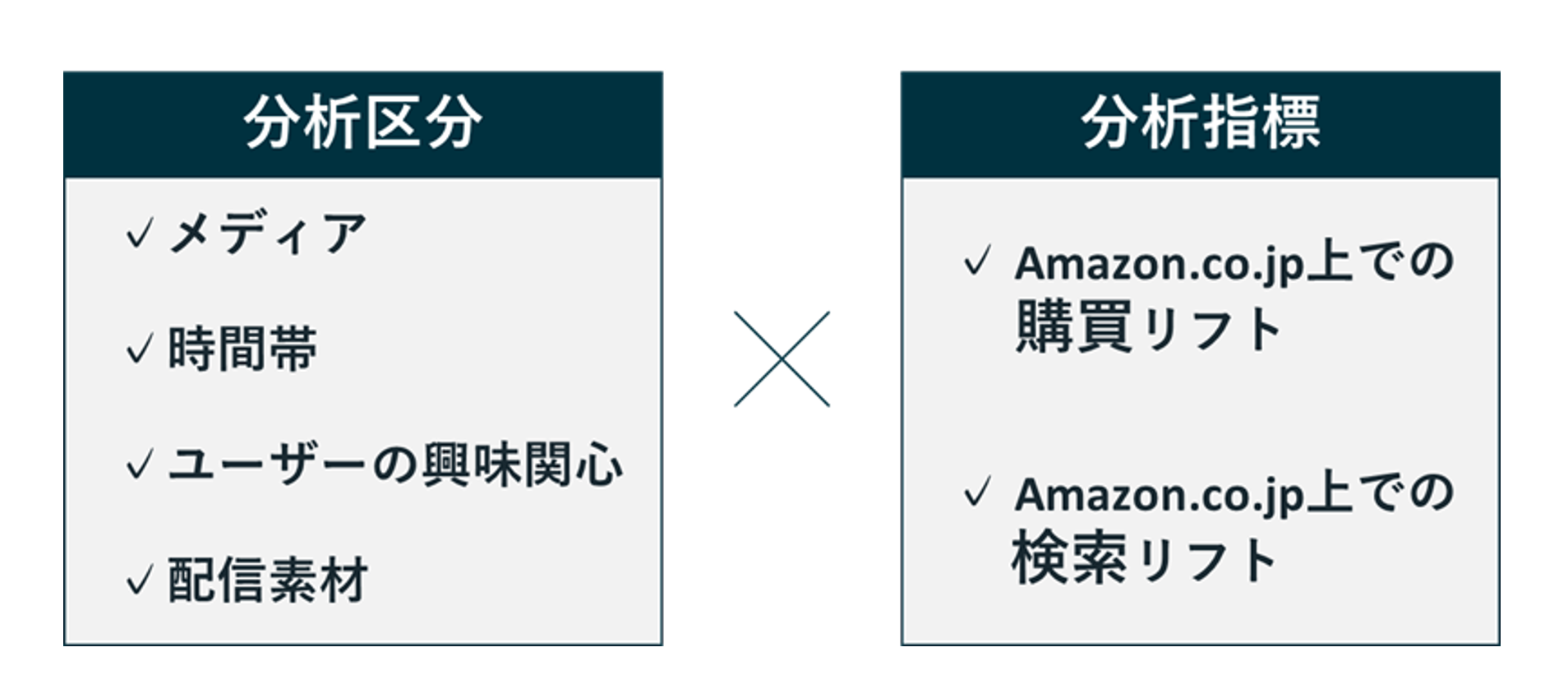 Amazon Marketing Cloudを使ってAmazon Adsのシグナルと連携することによって、主に4つの区分で、Amazon.co.jp上の購買や検索を分析することが可能です。