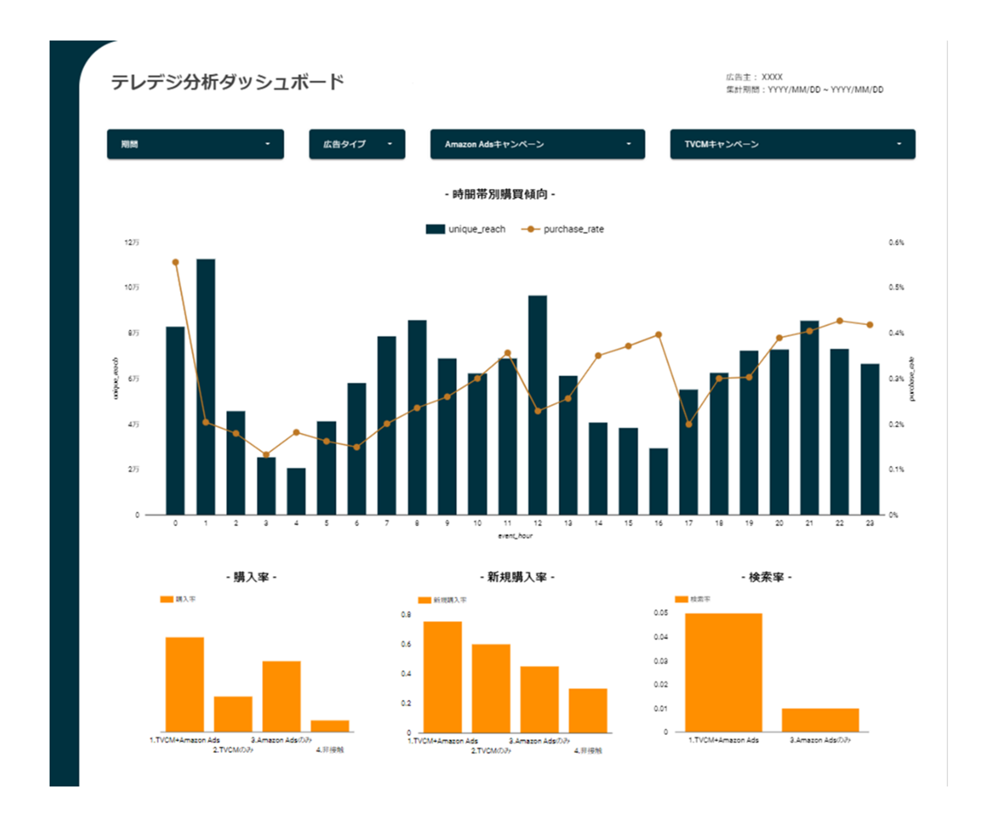 今回、第一弾としてAmazon Adsのシグナルと連携を開始します。博報堂DYメディアパートナーズ独自のアルゴリズムを活用し、Amazon Adsのシグナルを含む各種インサイトを掛け合わせて「Amazon Marketing Cloud」(※2)上で分析をすることで、テレビCM・Amazon Adsへの接触がAmazon.co.jp上での購買・検索行動に与える影響をダッシュボードで可視化することができます。これにより購入率や検索率等を指標とするテレデジ統合運用を可能とし、加えてテレデジを購買指標で分析できることから購買をKPIとするプラニングの最適化を実現します。