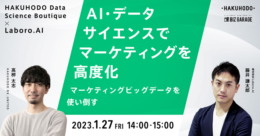 また、「カスタムAI」の提供などAI領域で高い専門性を持ち、博報堂と連携して業務を遂行している株式会社Laboro.AIの担当者も登壇し、 マーケティングにおけるデータサイエンス活用の考え方から具体事例までをお話しします。