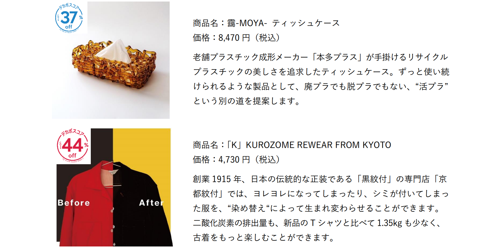 今回の施策では、「Earth hacks」で販売している脱炭素につながる商品を、デカボスコアや商品にまつわるストーリーと共に実際にご覧いただくことができ、気になった商品はその場でQRコードから購入も可能です。