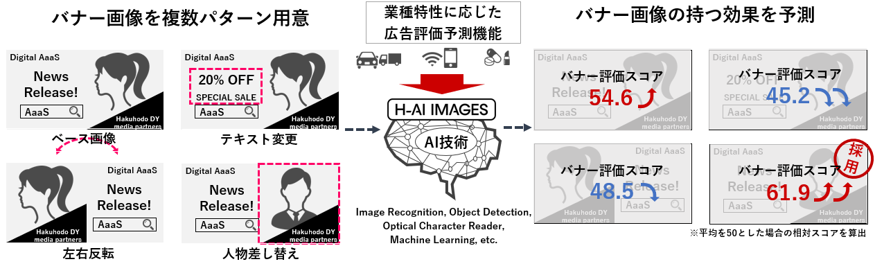 そこで、博報堂DYメディアパートナーズは博報堂DYホールディングスのグループ横断型の研究開発組織「Creative technology lab beat(※3)」と共同で、配信前のバナー画像の広告効果を、業種特性に応じて予測・評価する機能「H-AI IMAGES」を開発し、Digital AaaSに搭載しました。