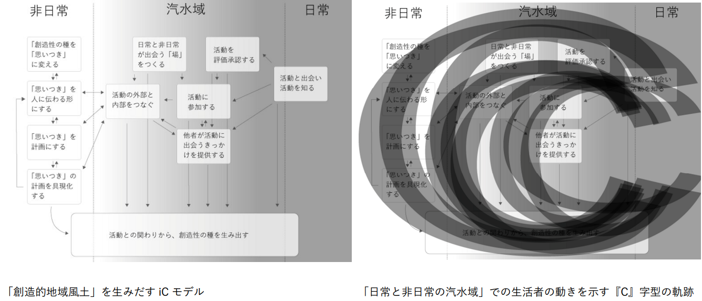 このiCモデルは、「日常と非日常の汽水域」と「11の行動群」を核に、地域の創造性を育む新たなフレームワークを提供するものです。地域の日常生活と特別な瞬間(非日常)の間に存在する「日常と非日常の汽水域」に着目し、地域の人々が新たなチャレンジを行うきっかけを生み出すことを目指しています。