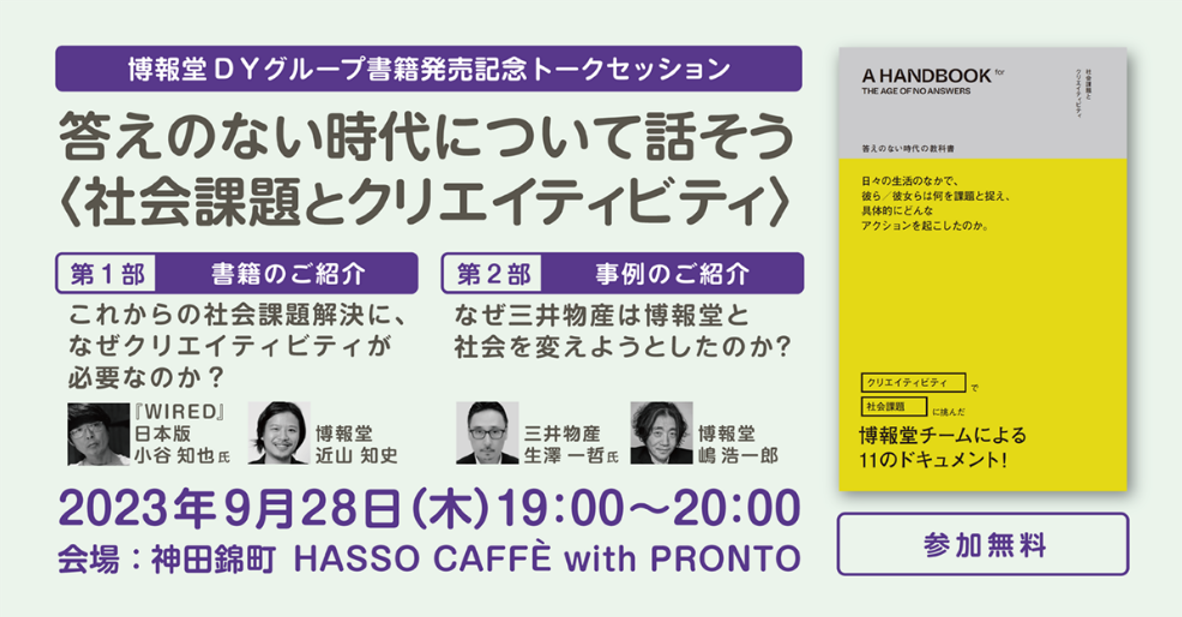 株式会社博報堂は、博報堂DYグループの携わった様々な事例からクリエイティビティによる社会課題解決の手法と実装法を紹介する書籍の発売を記念して、トークセッション「答えのない時代について話そう 社会課題とクリエイティビティ」を2023年9月28日(木)に博報堂旧本社跡地である神保町HASSO CAFFÈ にて開催しますのでお知らせいたします。