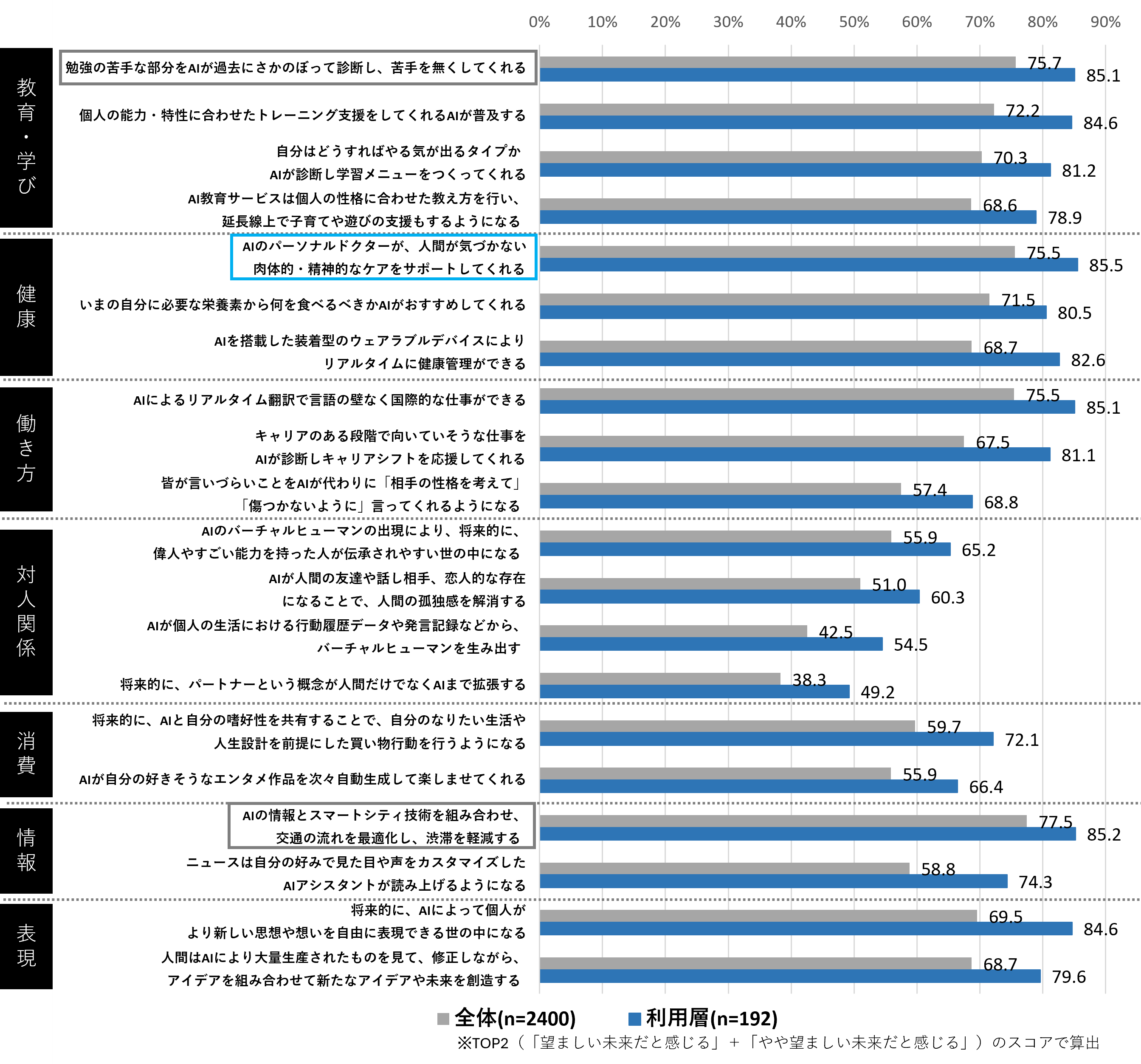 利用層もほぼ同様の傾向だが、全ての項目でAIの未来シナリオの受容度が高い結果となり、「AIのパーソナルドクターが、人間が気づかない肉体的・精神的なケアをサポートしてくれる」(85.5%)が最も支持された。