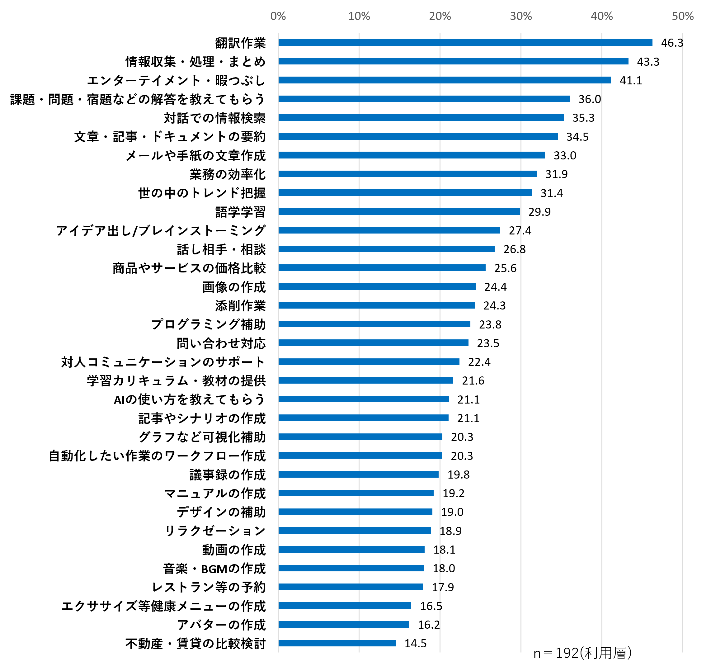 利用層に実際の利用用途を聞いたところ、月1回以上の利用で「翻訳作業」が1位(46.3%)となり、次いで「情報収集・処理・まとめ」(43.3%)、「エンターテイメント・暇つぶし」(41.1%)と続く。5位に「対話での情報検索」(35.3%)、11位に「アイデア出し/ブレインストーミング」(27.4%)、12位に「話し相手・相談」(26.8%)、など生成AIならではの利用用途も多く並んだ。