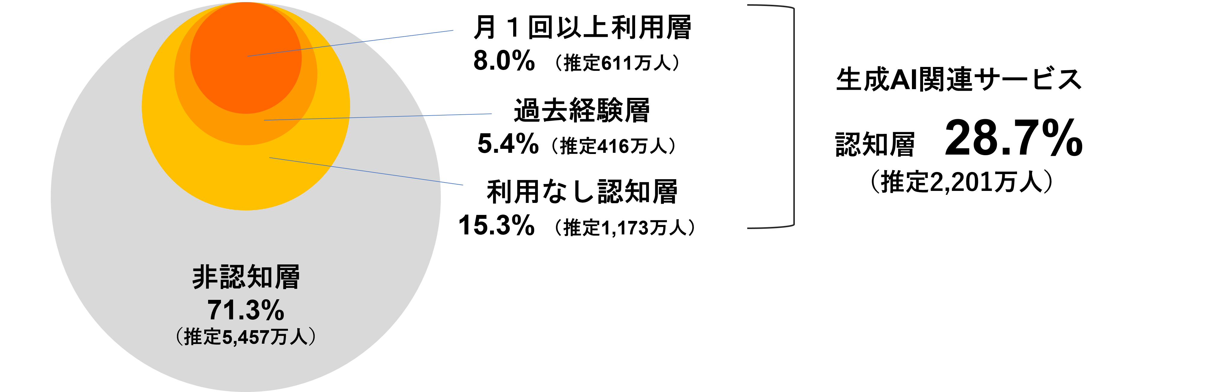 また、利用層も含めて、生成AI関連サービスの認知層は全体の28.7%となった。