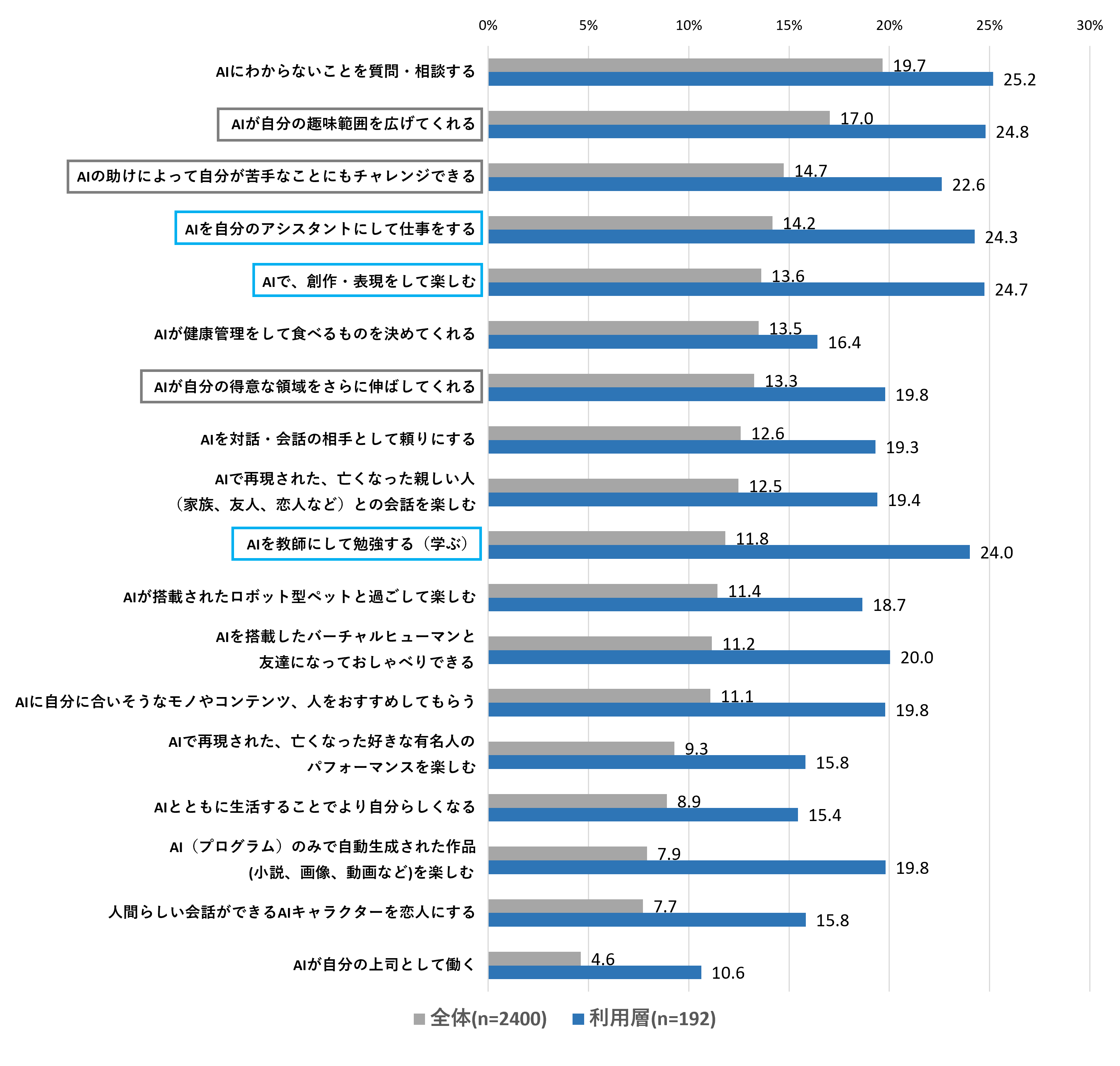利用層では1位・2 位は全体と同じものの、「AIで、創作・表現をして楽しむ」(24.7%)、「AIを自分のアシスタントにして仕事をする」(24.3%)、「AIを教師にして勉強する(学ぶ)」(24.0%)など、より具体的な目的にAIを活用しようとする回答が上位に並んだ。