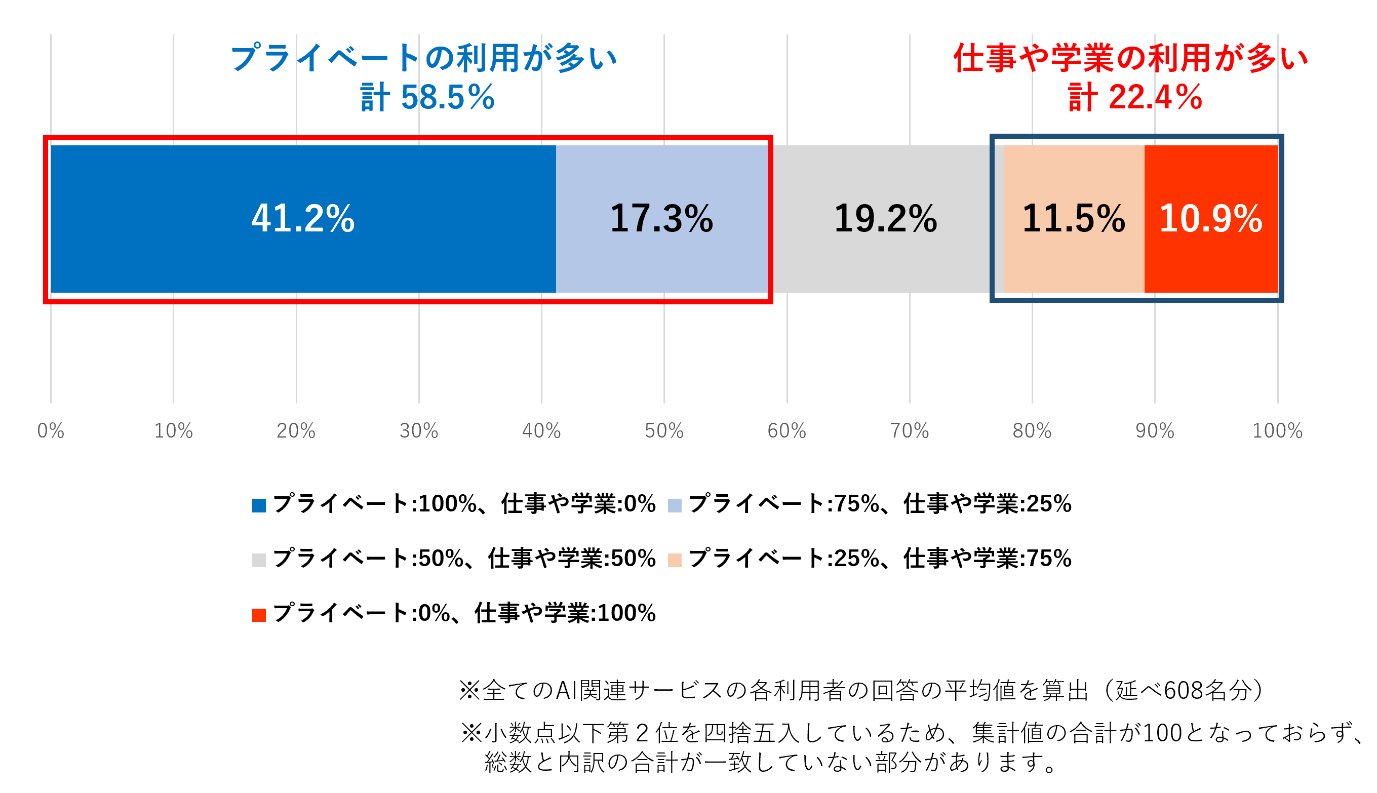 AI関連サービスを仕事や学業、またはプライベートで利用する場合、どのような割合で利用しているか聞いたところ、プライベートでの利用が100%と答えた人が41.2%、プライベートでの利用が75%を占めると答えた人が17.3%に上る結果となった。プライベートでの利用のほうが多い利用者が58.5%と過半数を占めた。