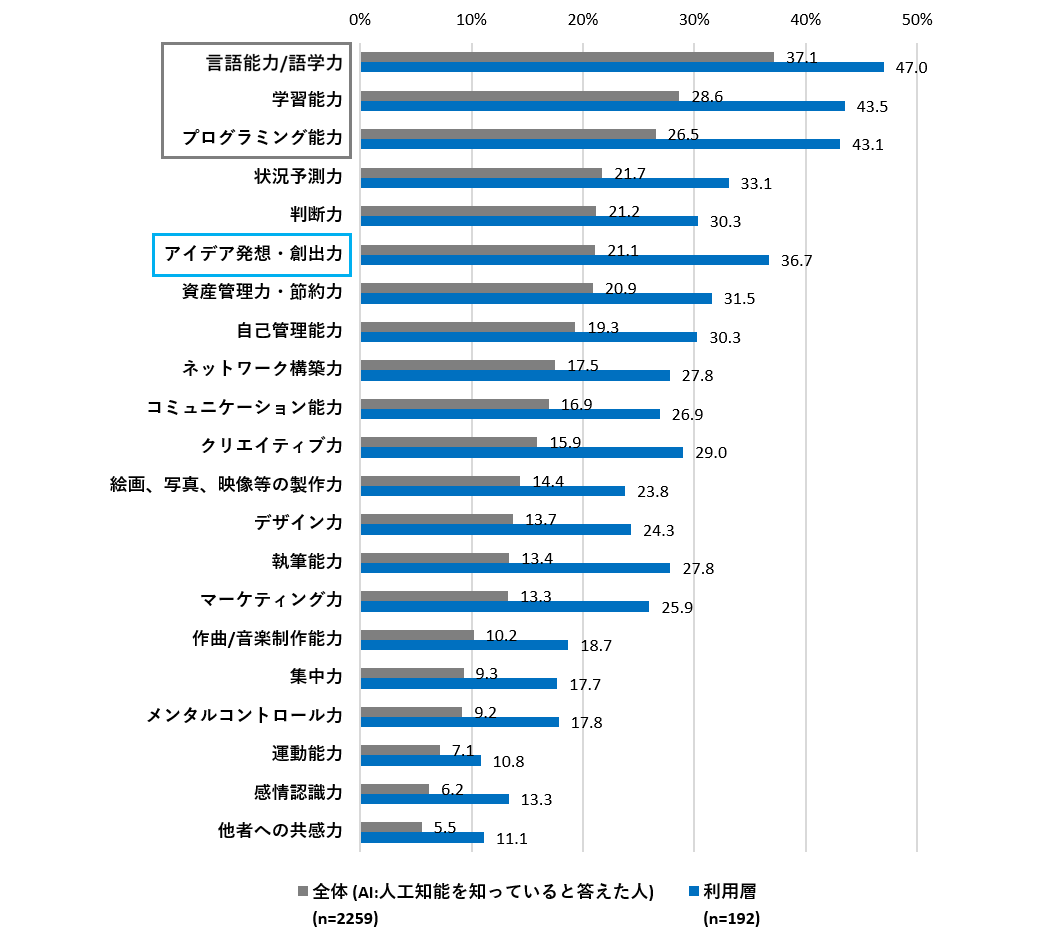 利用層のほうが全項目で高く、上位3項目は全体と同じ順だが、4位に「アイデア発想・創出力」(36.7%)が入り、利用層はAIの創造性に対する期待が高いことがうかがえる。