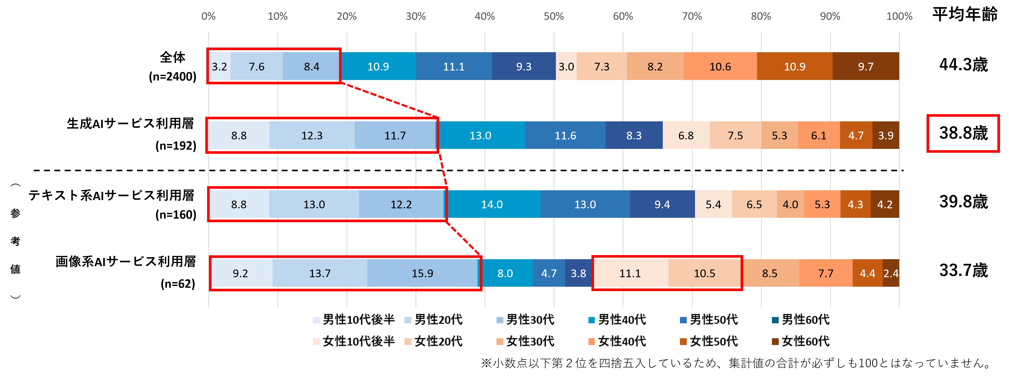 生成AIサービス利用層(利用層)の平均年齢は38.8歳。性年齢構成をみると、各AI関連サービス利用層において、全体と比べて10~30代男性の比率が高い。画像系AIサービス利用層は10~30代の男性が全体の約4割を占める。また10代後半女性が11.1%、20代女性が10.5%と、若年女性の高さも目立つ。