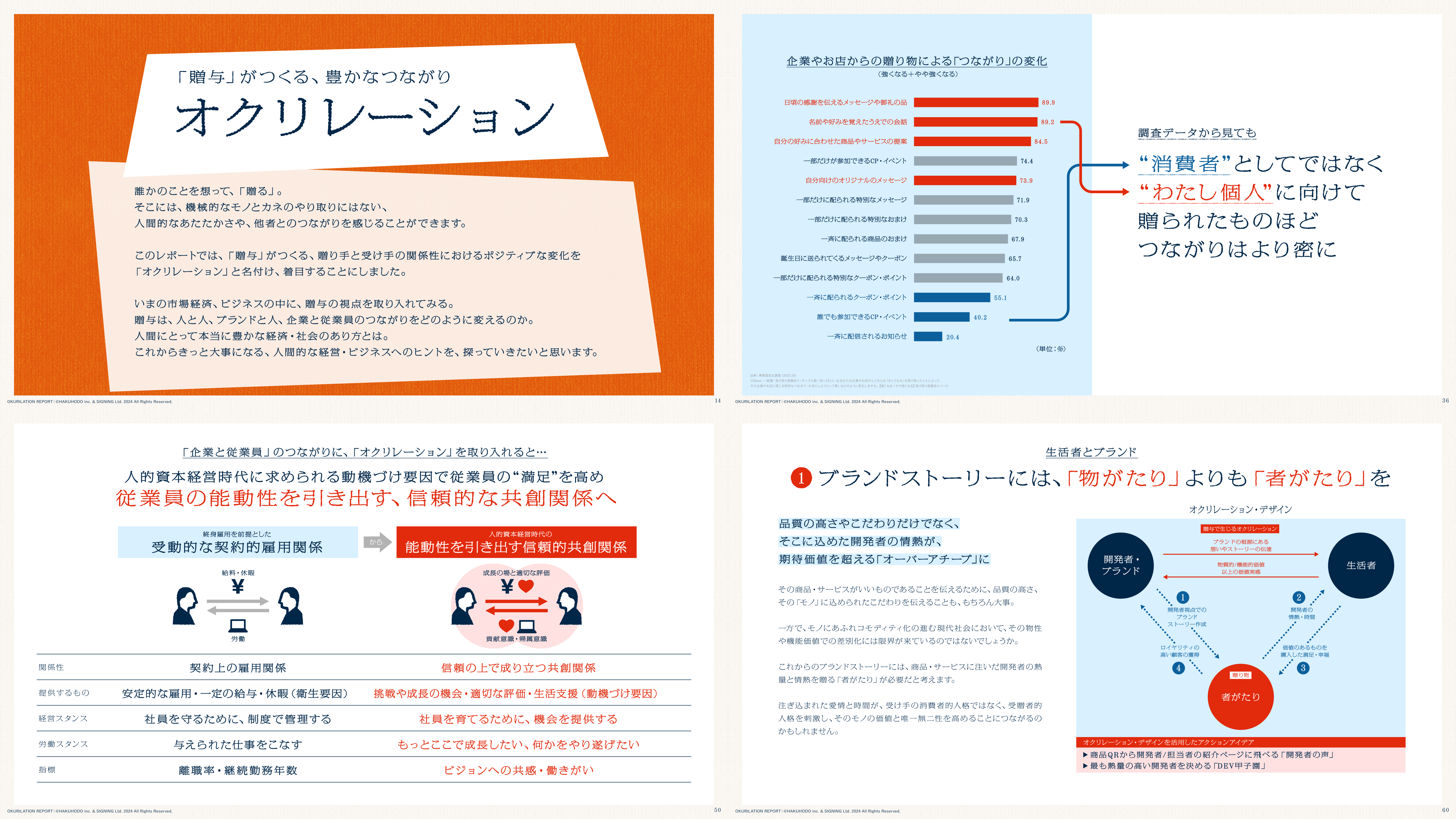 そこで、私たちは「贈与」の概念に着目しました。贈与と聞くと贈与税やプレゼントを想起しがちですが、私たちはお金やものに限らず、「相手のことを想って贈り物をすること」を「贈与」だと捉えました。贈るものそのものではなく、そこに込められた想いに価値がある「贈与」には、機械的なモノとカネの交換にはない人間らしさやあたたかさが存在し、人と人とのつながり・幸福を増幅させるのではないかと考えます。本レポートでは、贈与がつくる贈り手と受け手の関係性におけるポジティブな変化を「オクリレーション」と名付け、着目しています。「オクリレーション」の視点でブランドと生活者、企業と従業員のつながりについて考察しながら、人間にとって本当に豊かな経営・ビジネスへのヒントを探る取り組みです。