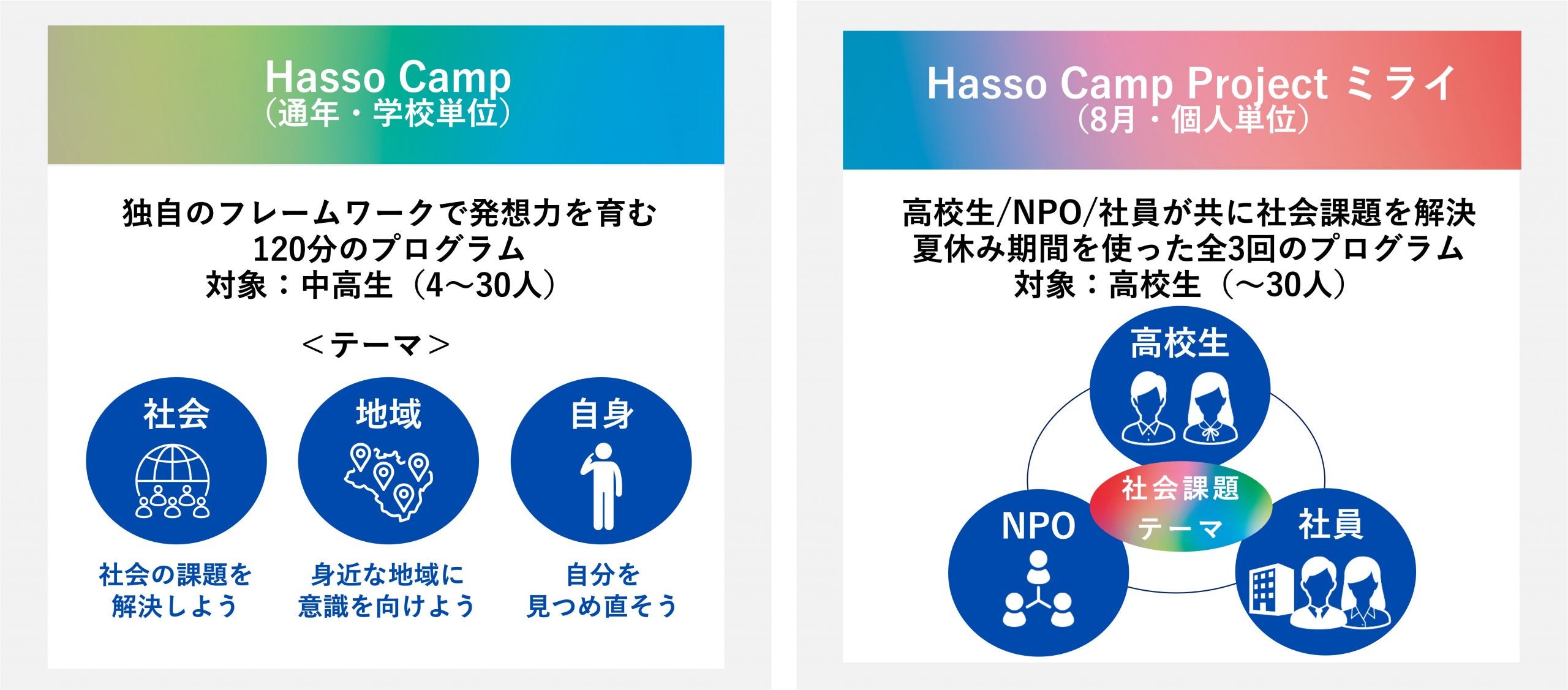 Hasso Campには、①年間を通して応募でき学校単位で実施する「Hasso Camp」と、②長期の休暇期間中に高校生が個人で参加できる「Hasso Camp Project ミライ」の2つのプログラムがあります。