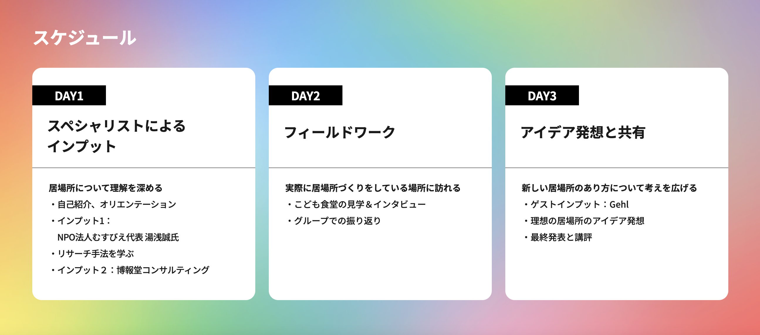 そのような背景に着目し、今年のプログラムのテーマを「Ibasho(居場所)」としました。全3回の本プログラムには、「こども食堂」の支援を通じ、誰もとりこぼさない社会の実現を目指して活動する「認定NPO法人全国こども食堂支援センター・むすびえ」の理事長 湯浅誠氏、人間を中心に据えた都市づくりや場所と人の関係性の捉え直しから、居場所の新しい価値の発見を目指す博報堂DYグループの各領域のスペシャリストたちが、講師やチームメンバーとして参加。次世代を担う高校生の皆さんと博報堂DYグループ社員が1つのチームになり、これからのIbashoについて考えていきます。