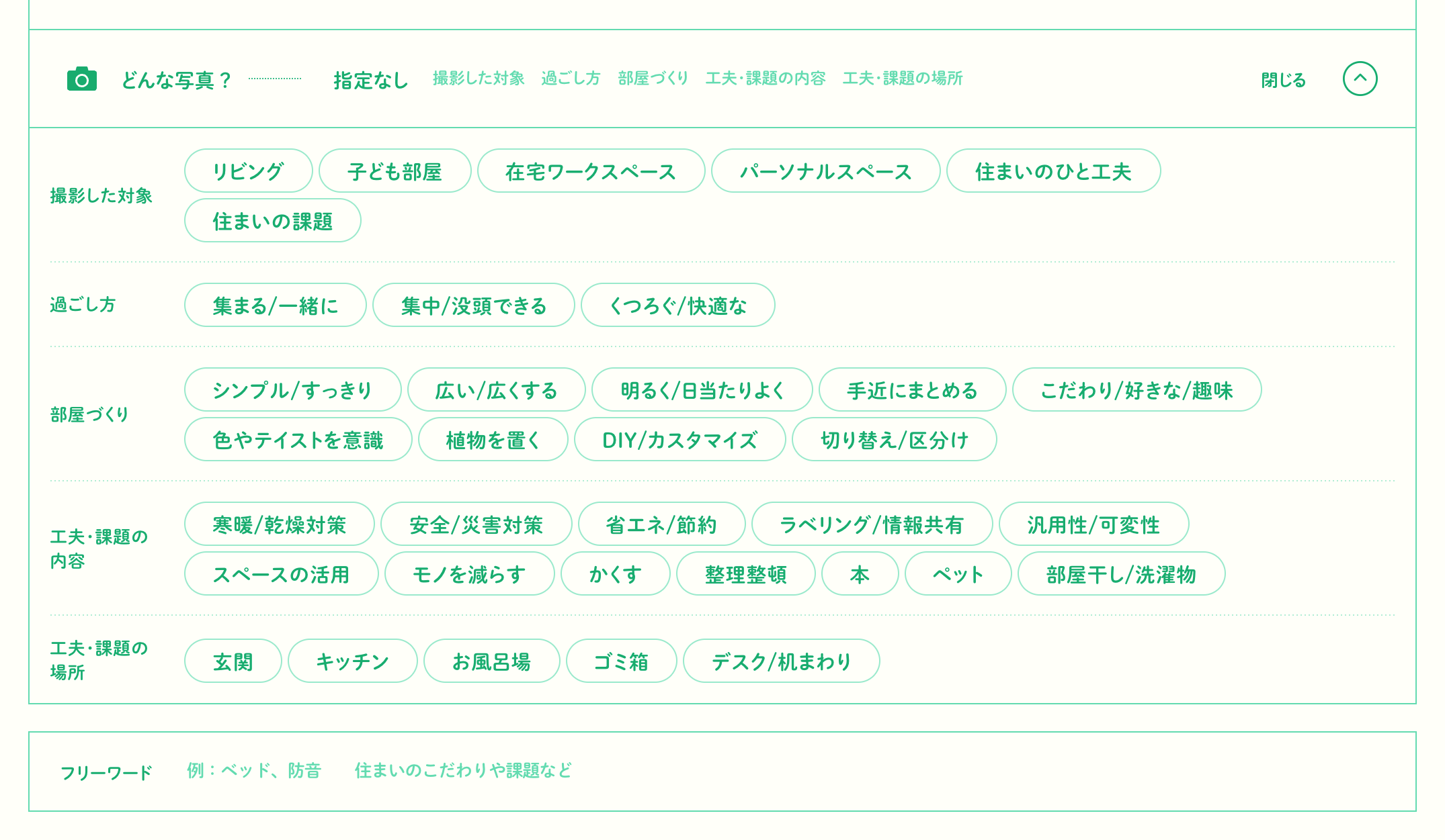 「住」に関する生活写真は1,375枚にわたり、「リビング」「子ども部屋」「在宅ワーク」「パーソナルスペース」「住まいのひと工夫」「住まいの課題」などの撮影対象毎にご覧いただけます。また撮影者の性別・年代・居住地などの特性などからも自由に検索が可能です。