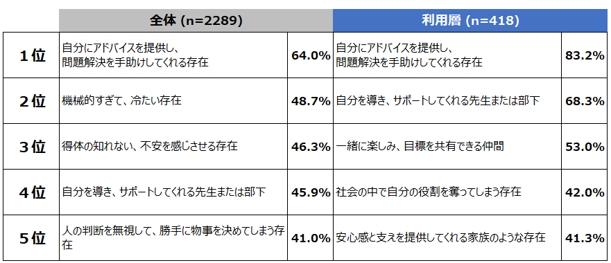 AIは例えるならどんな存在なのか聞いたところ、全体、利用層ともに、1位は「自分にアドバイスを提供し、問題解決を手助けしてくれる存在」(全体64.0%/利用層83.2%)であった。全体では、2位「機械的すぎて、冷たい存在」(48.7%)、3位「得体の知れない、不安を感じさせる存在」(46.3%)と続くが、利用層に絞ると、2位「自分を磨き、サポートしてくれる先生または部下」(68.3%)、「一緒に楽しみ、目標を共有できる仲間」(53.0%)とポジティブな存在として捉えられている傾向が確認できる。