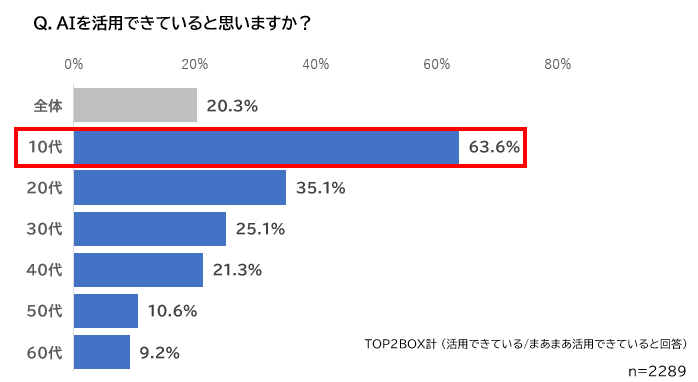 AIの活用度合いを確認すると、10代男女は「AIを使いこなしている」と自認している割合が63.6%と全世代平均(20.3%)と比較して特に高く、AIネイティブ世代と呼ぶことができる。急速にAIが生活に浸透していく中で、10代は社会人になる前のタイミングで既に生成AIが実装されている各種ツール類やSNSを使いこなしていることが伺える。