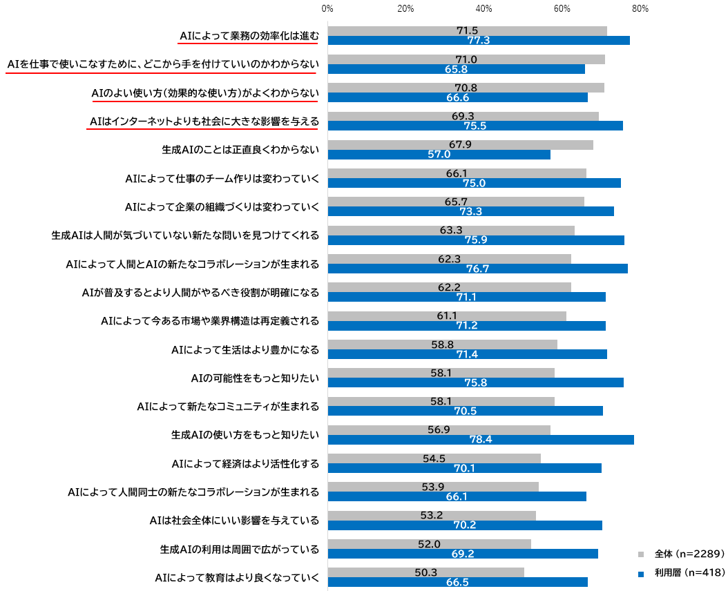一方、利用層では「生成AIの使い方をもっと知りたい」(78.4%)、「AIによって人間とAIの新たなコラボレーションが生まれる」(76.7%)、「生成AIは人間が気づいていない新たな問いを見つけてくれる」(75.9%)、「AIはインターネットよりも社会に大きな影響を与える」(75.5%)など新たな価値創出への期待意識が上位に並んだ。