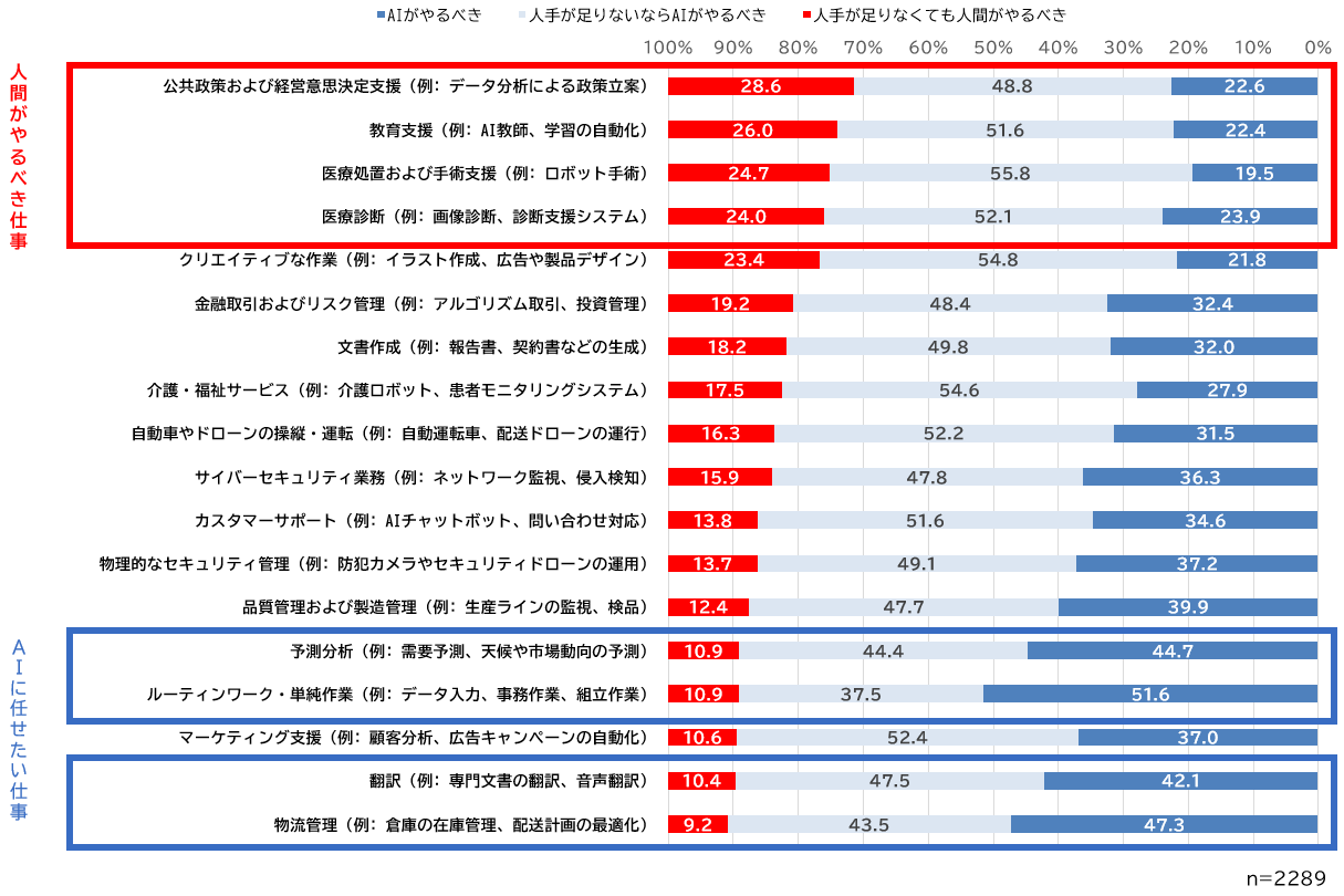 生活者に人手不足が解消される可能性を想定した上で、人間がやるべき仕事と、AIに任せたい仕事を聞いたところ、人手が足りなくても人間がやるべき仕事として「公共政策および経営意思決定支援」(28.6%)、「教育支援」(26.0%)、「医療処置および手術支援」(24.7%)、「医療診断」(24.0%)が上位に並んだ。 一方、AIに任せたい仕事としては「ルーティンワーク・単純作業」(51.6%)、「物流管理」(47.3%)、「予測分析」(44.7%)、「翻訳」(44.1%)が上位に並んだ。