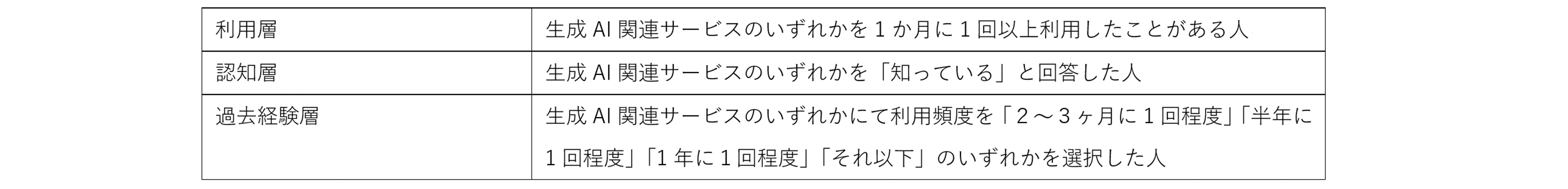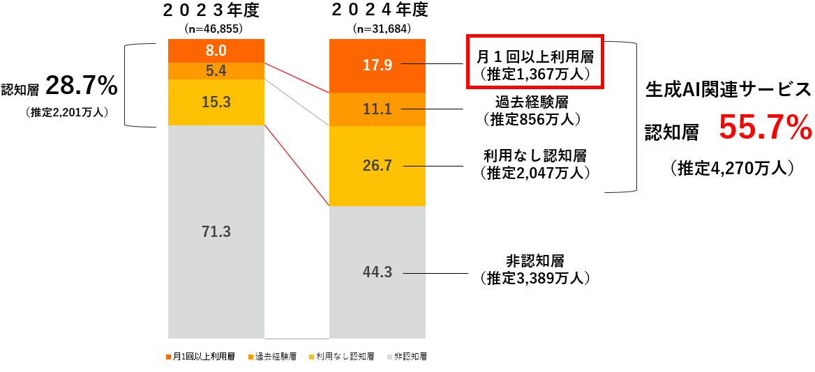 生成AI関連サービスを1か月に1回以上利用している人(以下、利用層)は全体の17.9%となった。昨年の8.0%から2倍以上の伸びとなっている。また、生成AI関連サービスを知っているという認知層は全体の55.7%と、2023年の調査結果と比較すると生成AI関連サービスが急速に浸透していることが確認できる。
