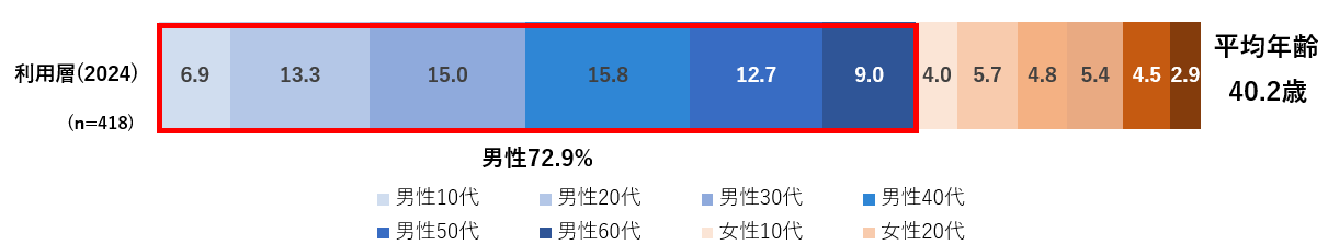 利用層の平均年齢は40.2歳。男性比率が72.9%と高い。