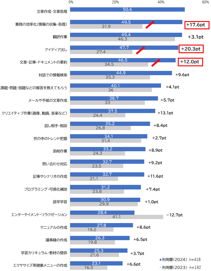 利用層(月1回以上の利用者)に実際の利用用途を聞いたところ、「文章作成・文章処理」が1位(50.6%)となり、次いで「業務の効率化」(49.5%)、「翻訳作業」(49.4%)、「アイディア出し」(47.7%)と続く。2023年度調査結果と比較すると、「アイディア出し」「業務の効率化」「文章・記事・ドキュメント要約」の用途が特に増加している傾向が確認できる。