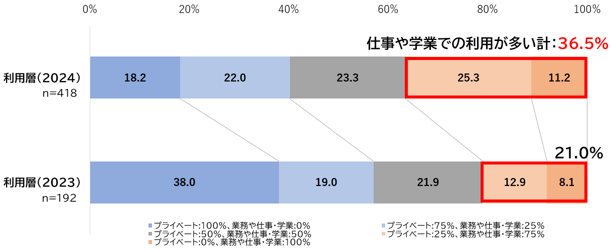 AI関連サービスを仕事や学業、またはプライベートで利用する場合、どのような割合で利用しているか聞いたところ、プライベートでの利用が多いと答えた人は40.2%、業務や仕事・学業で利用することが多いと答えた人は36.5%となった。2023年度調査結果と比較すると、業務や仕事・学業で利用することが多いと答えた人の割合が増加しており、AIを仕事や学業で利用する傾向が高まっていることが確認できる。