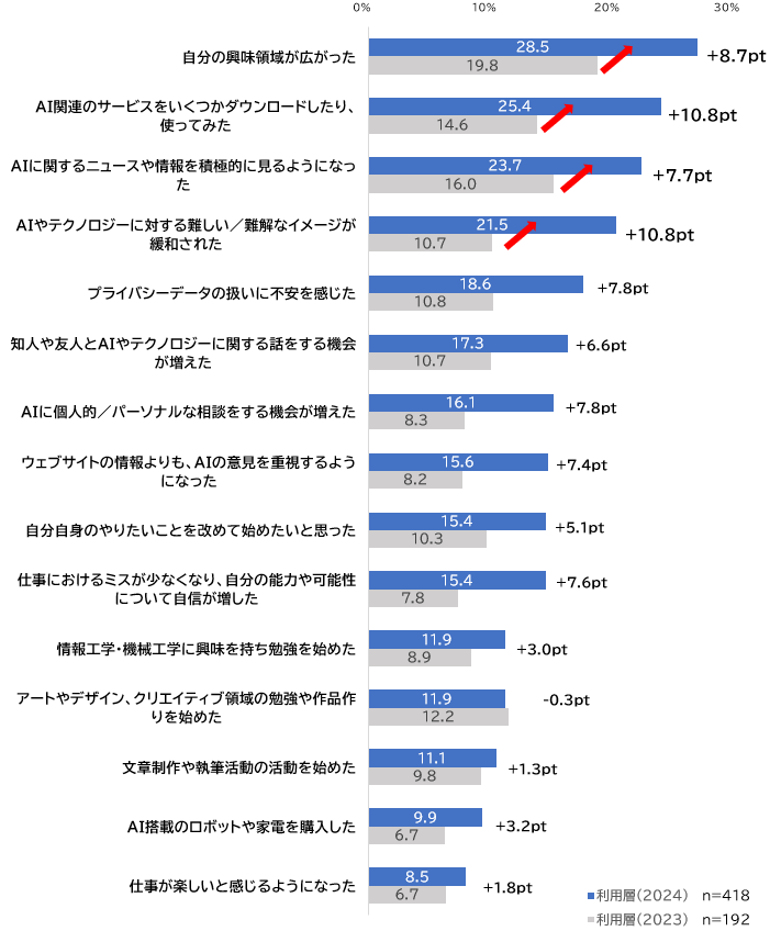 利用層に、AI関連サービス利用後にどのような行動や意識の変化があったのか聞いたところ、「自分の興味領域が広がった」(28.5%)がトップ。次いで、「AI関連のサービスをいくつかダウンロードしたり、使ってみた」(25.4%)、「AIに関するニュースや情報を積極的に見るようになった」(23.7%)、「AIやテクノロジーに対する難しい/難解なイメージが緩和された」(21.5%)が続く。2023年度調査結果と比較すると、ほぼすべての項目で生活者の行動・意識変化は高まっていることが確認できる。