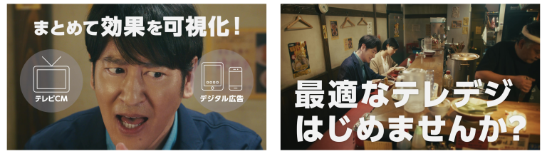 テレビCMは効果が測定できるのか、出稿経験のない田中部長は疑問に思います。そこで、部下はすかさず、「AaaSなら、テレビCMとデジタル広告の効果を、同一指標で可視化しまとめて最適化できる」ことを部長に教えます。AaaSがあればビジネス成果に繋がるテレビCM出稿ができるかも…と、ニヤリとする田中部長。しかし、やっぱり決断できず、あったかいうちにとラーメンを食べ始めてしまいます。