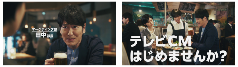 テレビCMを部下から提案されるも、はじめての出稿に不安を抱える田中部長。博報堂DYグループの経験豊富なプロがテレビCM出稿をフルサポートしてくれることを知り、期待の表情に。しかし、料理に気を取られ決め切らない田中部長に、部下は呆れてしまいます。