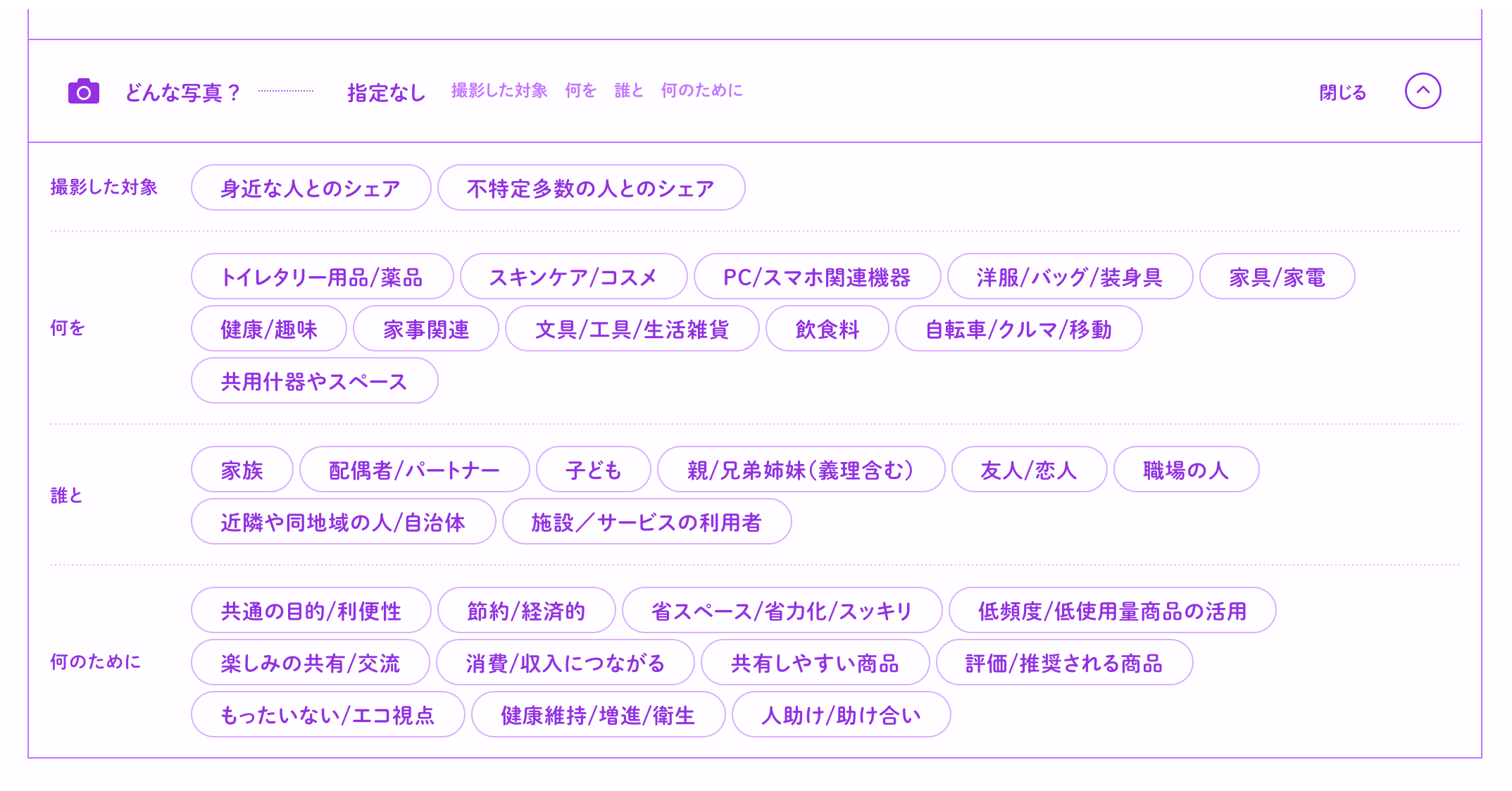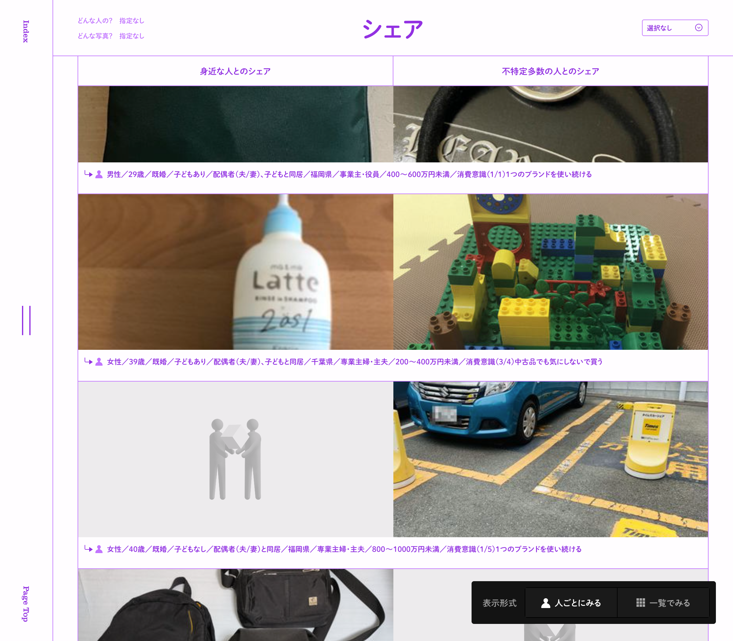 「シェア」に関する生活写真は310名の方が提供してくださった400枚で、撮影対象は「身近な人とのシェア」と「不特定多数の人とのシェア」で分かれているほか、撮影者の性別・年代・居住地などの特性からも自由に検索が可能です。