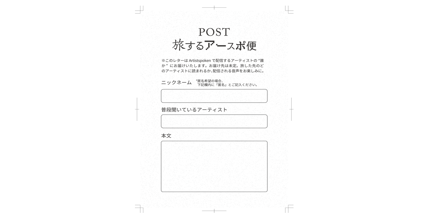 普段はアプリ上でアーティストに送っているレターを、今回は来場者のみなさんに“手書き”で投函いただける『POST|旅するアースポ便』を設置。このレターは、Artistspokenで配信しているどのアーティストに届くかは分かりません。誰が、どんな想いを書いて、どの番組で読み上げられるのか——音声を聴くまでのお楽しみです。